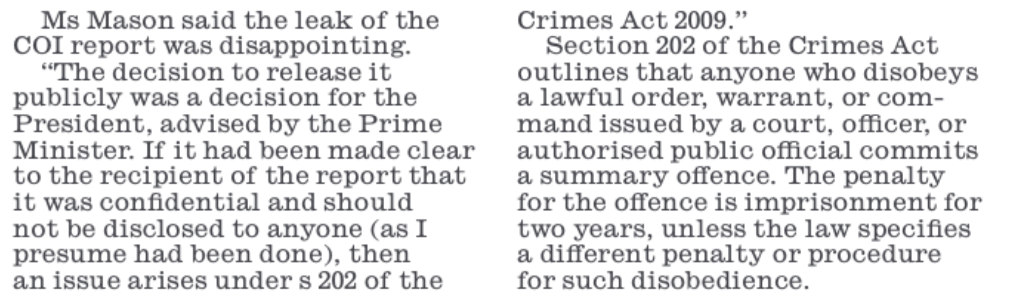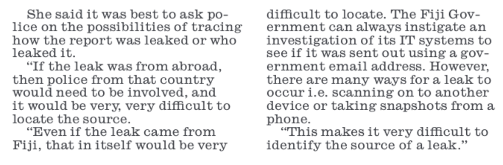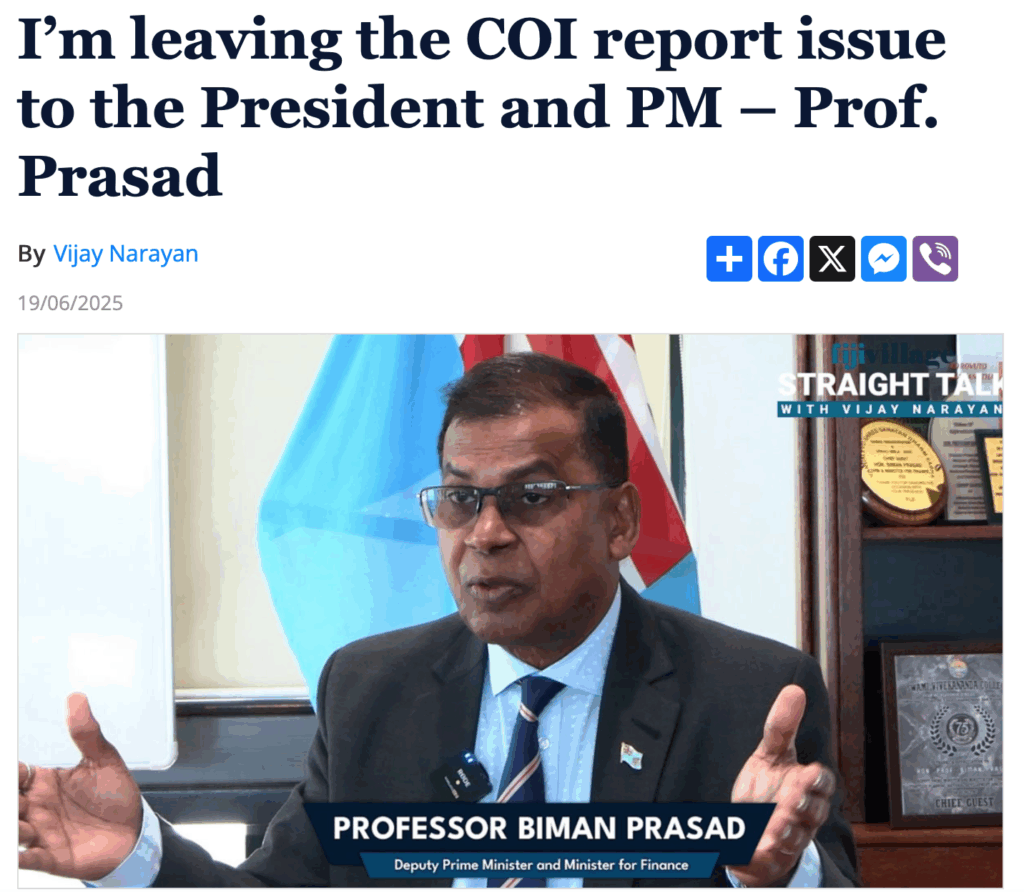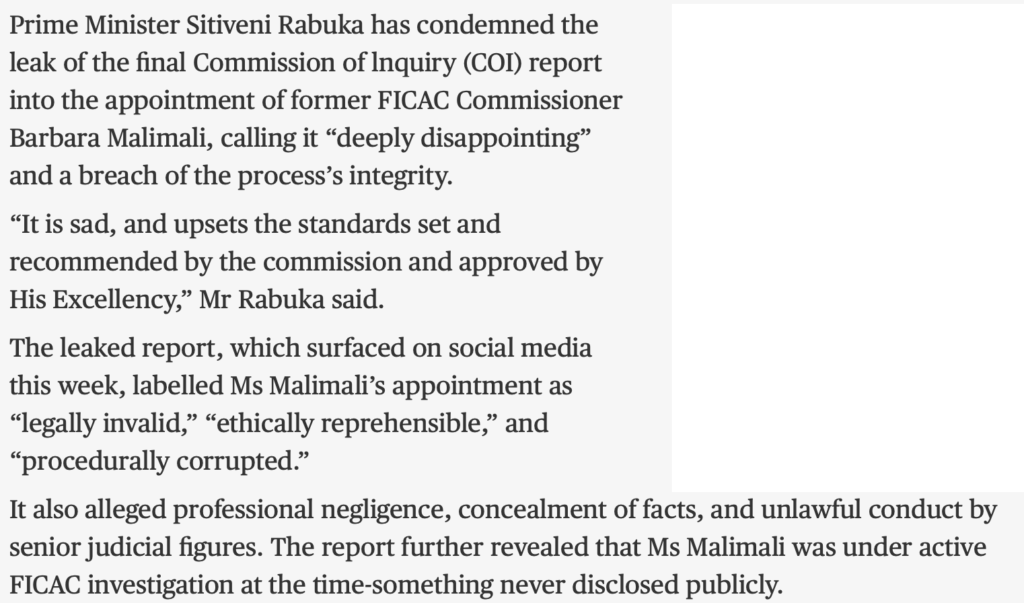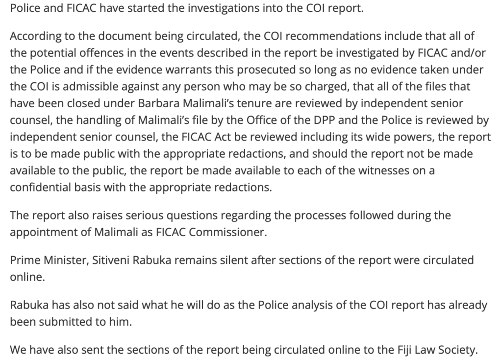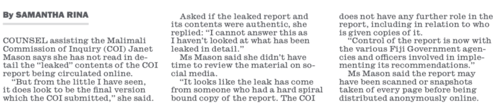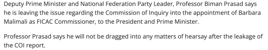He also says that only “sections of the Report ” have been leaked. Grubsheet has published all sections except the annexures so the ENTIRE Report in relation to its findings is now on the public record. It is undeniably authentic but Vijay Narayan is reporting none of it, especially the sections relating to Biman Prasad and Manoa Kamikamica.