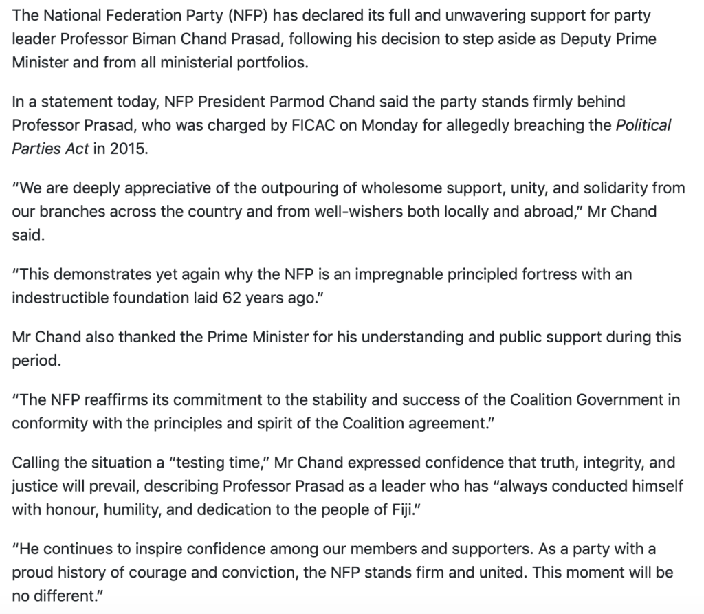 Four months after the NFP pledged “full and unwavering support” for its leader and sidelined deputy prime minister, Biman Prasad, over the criminal charges he is facing, that support is starting to waver.