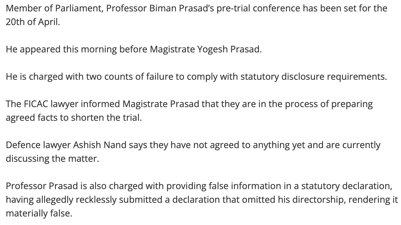 So who knows? Maybe Parmod Chand it is. Certainly for the NFP, the prosecution of Biman Prasad is an unmitigated disaster and not just for the Party but some of the individuals who face being deprived of their patron, including Prasad’s lawyer in the current proceedings.