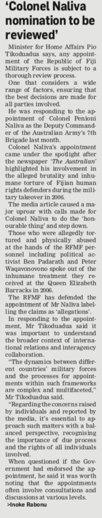 The Fijian media has begun to run the accounts of this alleged abuse, including an interview by the Fiji Times with the human rights activist, Pita Waqavonovono, who slams the RFMF Commander for rejecting allegations of abuse at the Camp during the coup of 2006. This is repeating some of what we already know from interviews with The Australian by Waqavonovono, Sam Speight and Ben Padarath. And there are plenty of others who can attest to the same thing, including Laisa Digitaki, Virisila Buadromo and Richard Naidu. So Ro Kalouniwai is on a hiding to nothing trying to peddle a narrative that there is “nothing to see here”.