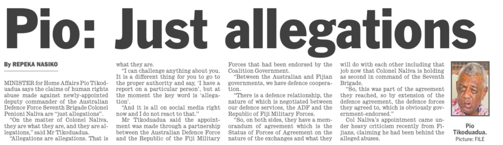 It has taken the Fijian media a long time to cotton on to the story that broke not on “social media” – as the Home Affairs Minister, Pio Tikoduadua and the RFMF Commander, Major General Ro Jone Kalouniwai keep falsely suggesting – but on the front page of The Australian, the country’s most influential newspaper.