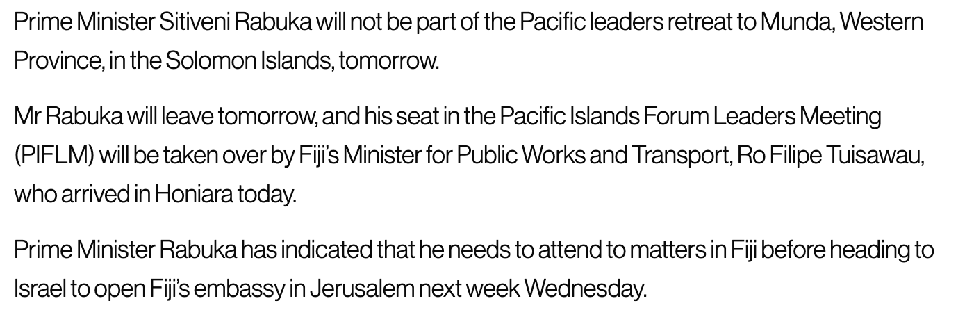 The President and the First Lady were chief guest at the opening of a rice mill on Vanua Levu, and presumably they still there because it can’t hardly be justified for his excellency to travel for just one event, as the Commissioner Northern himself could of opened it. So Rabuka will probably be talking to a blank wall if he were planning to speak to his excellency after arriving from the Forum Leaders meeting in Honiara and before flying off to Jerusalem with his entourage. The circus continues.
