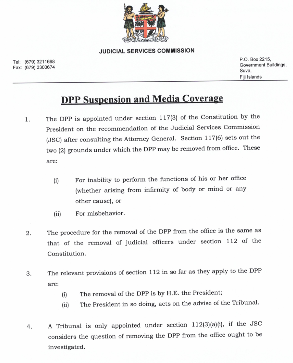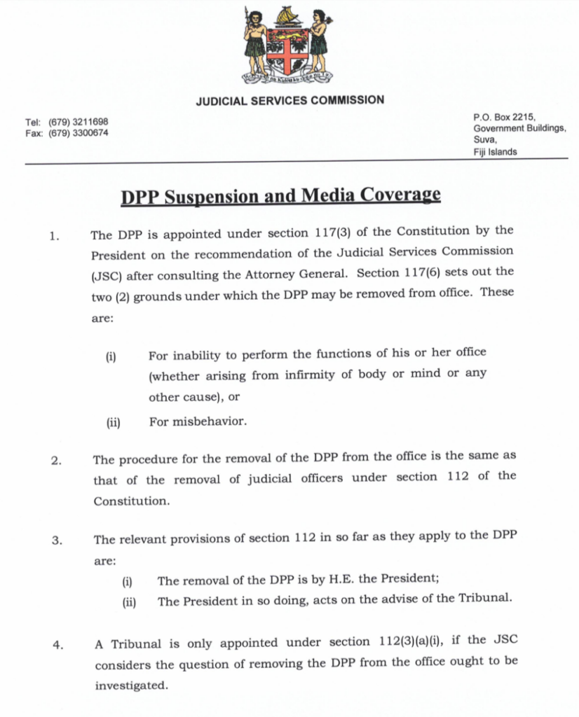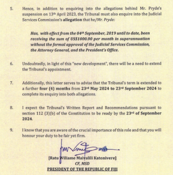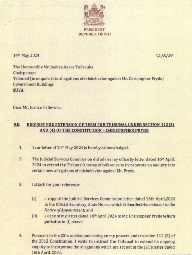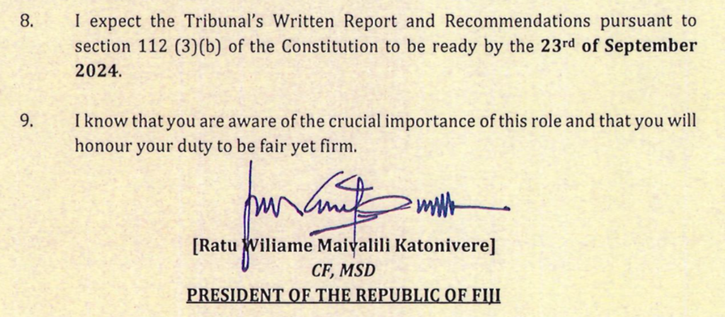 Here’s an extract of what the Head of State wrote in May on the advice of the Acting Chief Justice to the Chair of the Tribunal, Justice Anare Tuilevuka, and his fellow judges, Justice Samuela Qica and Justice Chaitanya Lakshman. (full letter below)