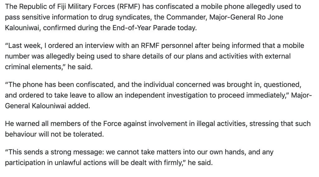 That corruption has now extended to the military itself with Kalouniwai’s admission that he has had to discipline one of his own soldiers for passing confidential information on anti-drug operations to ” external criminal elements”. (see below)