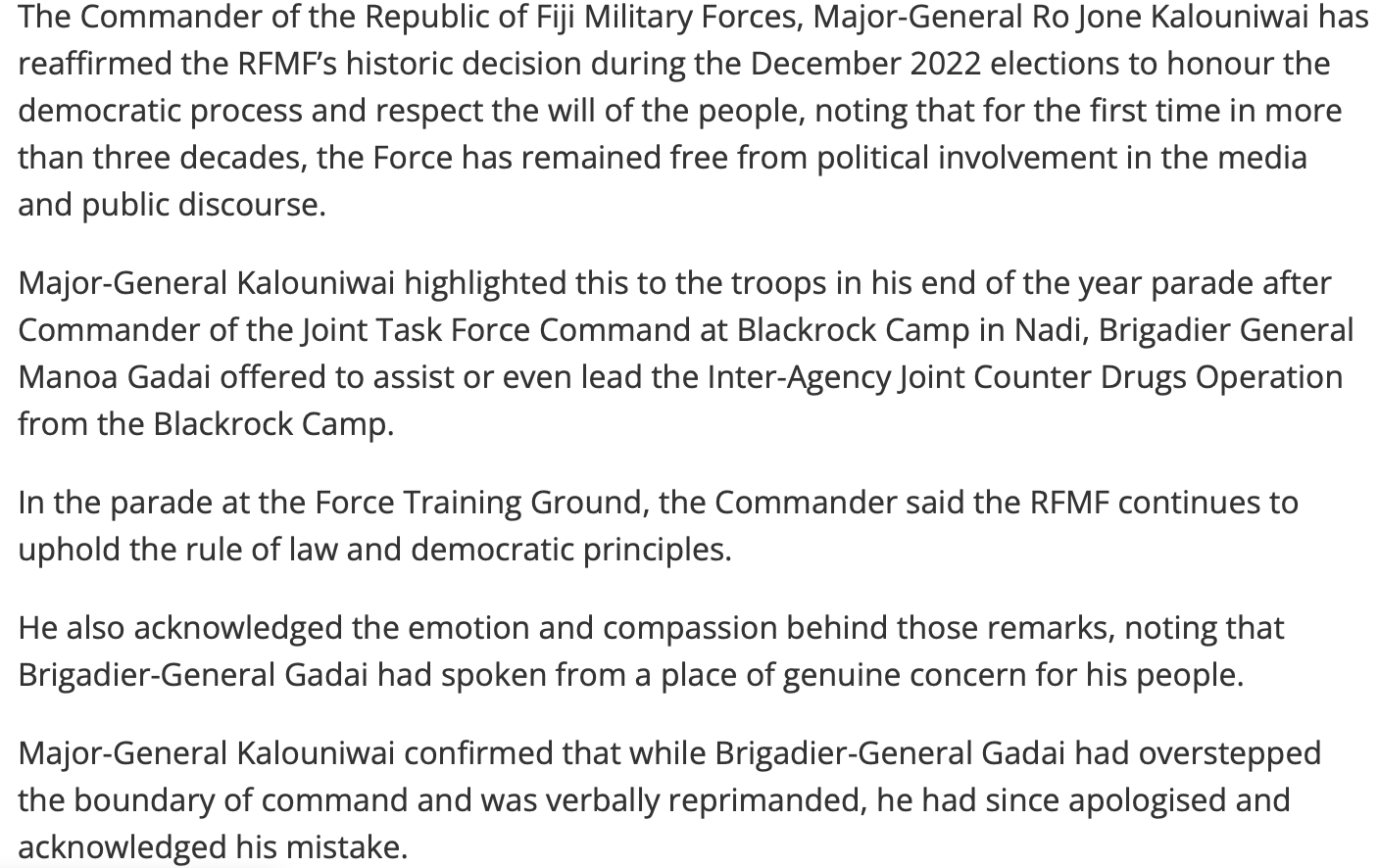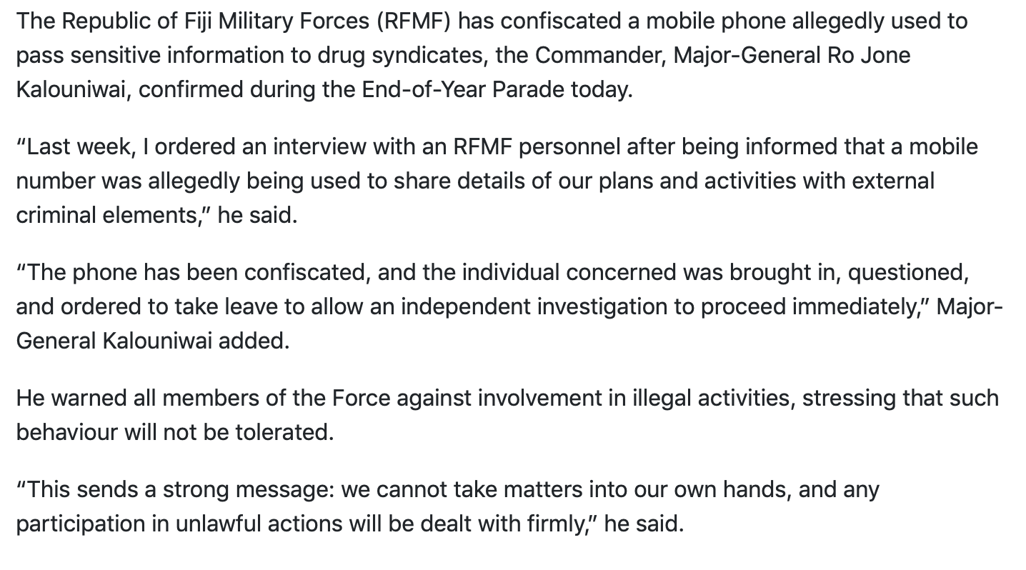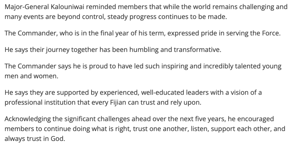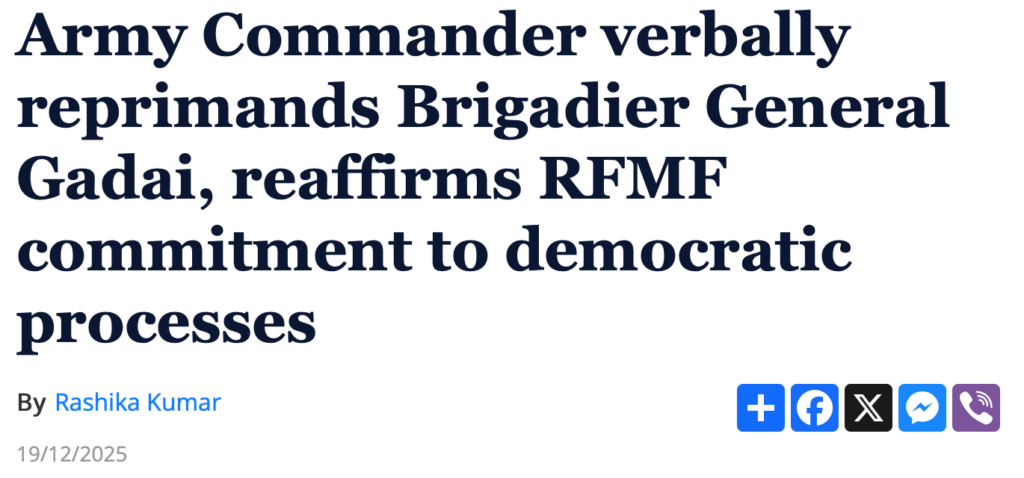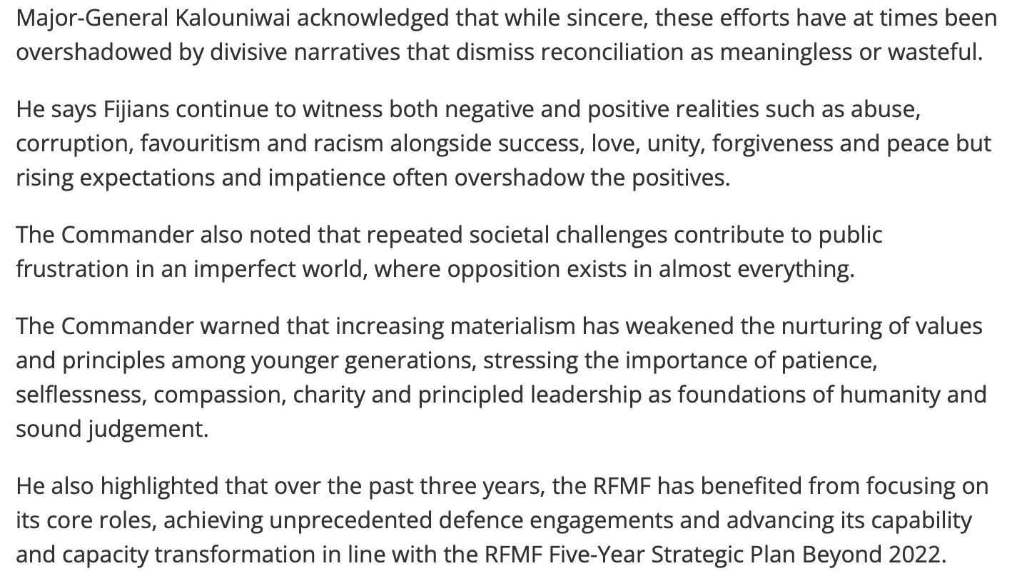 In response, Major General Kalouniwai publicly addressed the matter, confirming a breach of protocol and a verbal reprimand, while endorsing the underlying message and noting Gadai’s subsequent apology. However, by handling this disciplinary issue in a public forum during the RFMF’s end-of-year parade, the Commander himself aired internal matters externally, potentially amplifying perceptions of division at a sensitive time.