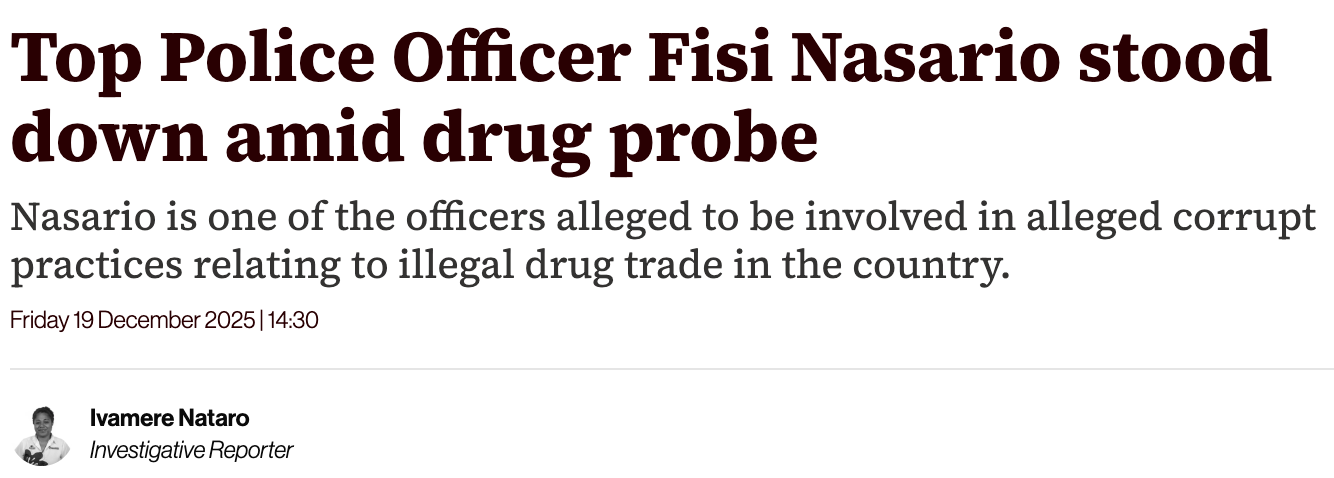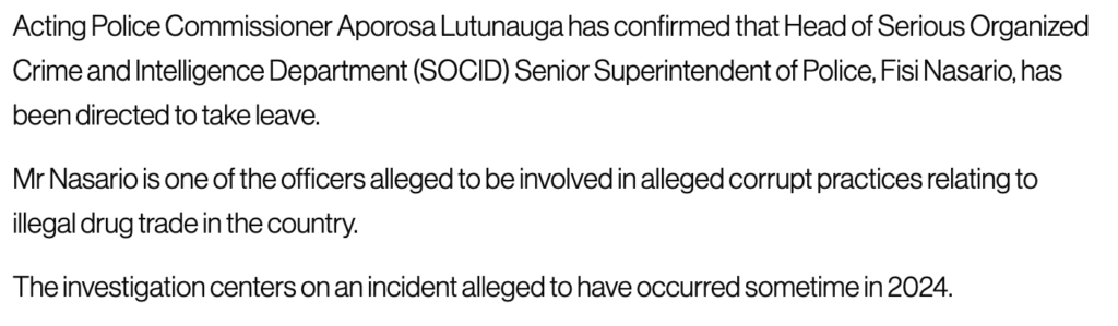 It also comes as the allegations of police involvement in the drug trade by the Sydney-based whistle-blower, Alexandra Forwood, have claimed their first scalp – the suspension of one of the nation’s most senior police officers, Fisi Nasario, the Head of the Serious Organised Crime and Intelligence Department (SOCID) (also see below)