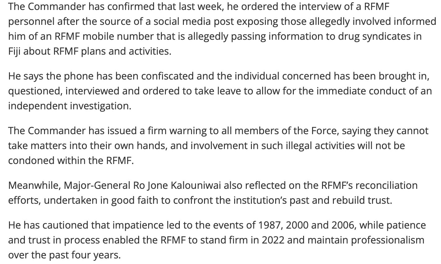 In the context of Fiji’s military history—marked by past political interventions and an ongoing push for reform under Major General Kalouniwai’s leadership, including reconciliation efforts, pledges of civilian supremacy and a commitment to breaking the cycle of interference — the handling of this incident presents a critical test. The RFMF has repeatedly emphasized a “fresh start,” with vows of transparency, accountability and strict adherence to democratic processes and the chain of command.