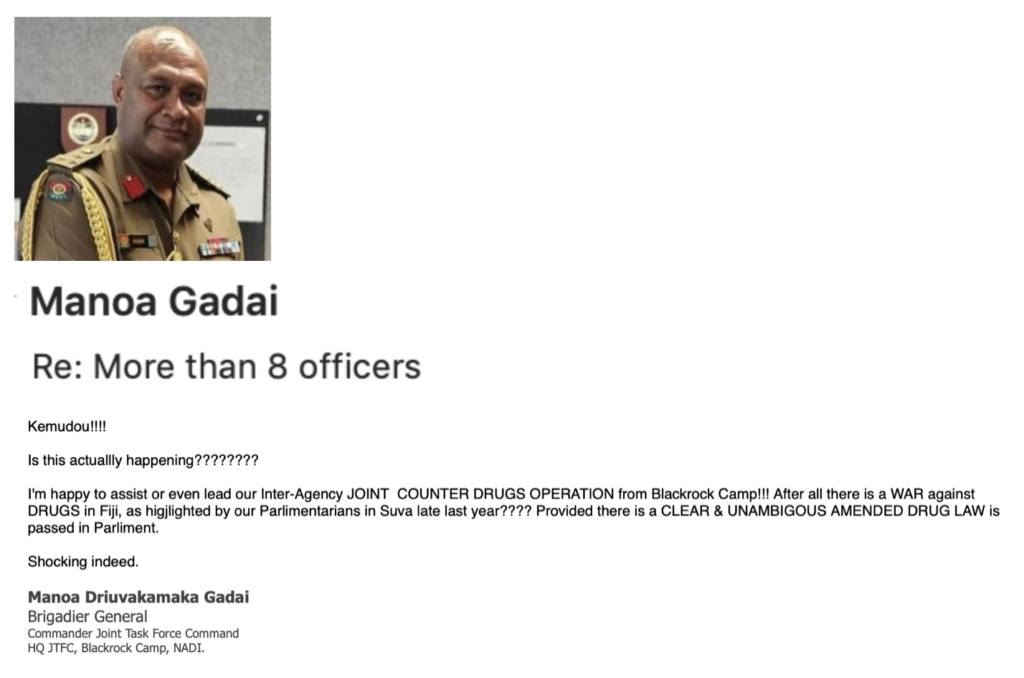 This historical precedent underscores the gravity of recent actions within Fiji’s Republic of Fiji Military Forces (RFMF) involving Brigadier General Manoa Gadai and Major General Jone Kalouniwai. Brigadier Gadai, as Commander of the Joint Task Force at Blackrock Camp, made unauthorized public statements offering military leadership in the national drug enforcement efforts, proposing a greater role for the armed forces in civilian law enforcement without prior approval through proper channels. While his concerns reflected genuine alarm over the escalating drug crisis—described by RFMF leadership as an existential threat to Fiji—these statements bypassed the chain of command and risked blurring lines between military and civilian responsibilities.