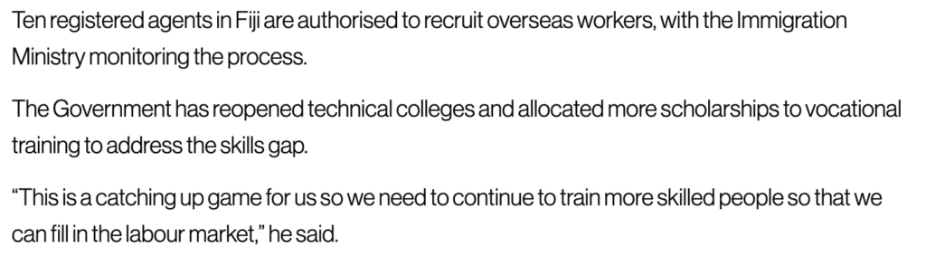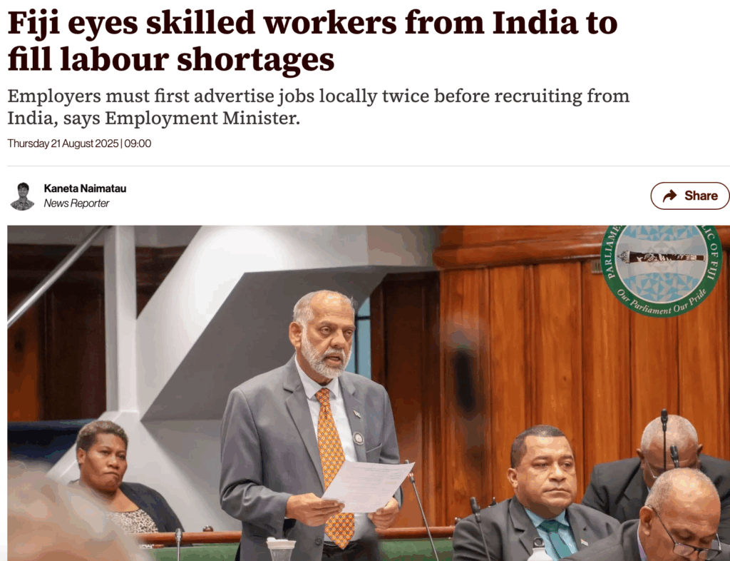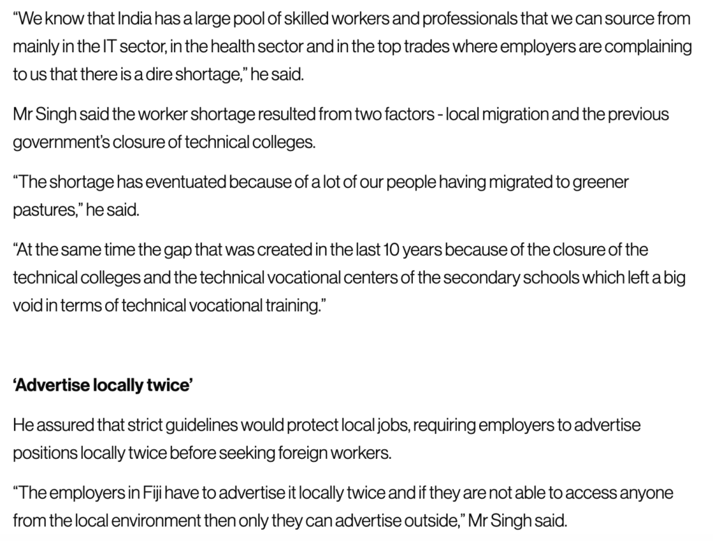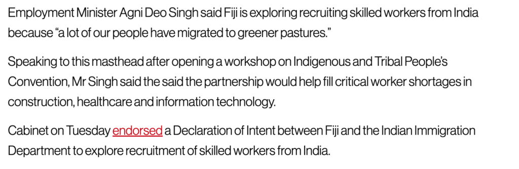 Well, guess what, Fiji? Having frightened off some of the country’s best and brightest people and especially the dreaded kai idia, the Coalition is now having to go to India to recruit skilled workers.