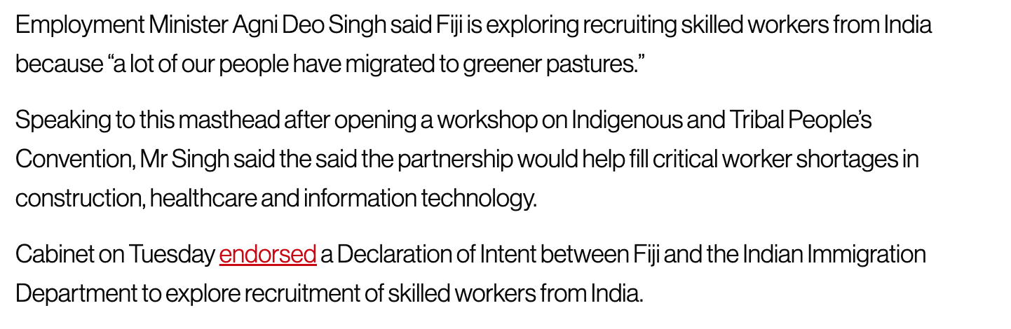 Well, guess what, Fiji? Having frightened off some of the country’s best and brightest people and especially the dreaded kai idia, the Coalition is now having to go to India to recruit skilled workers.
