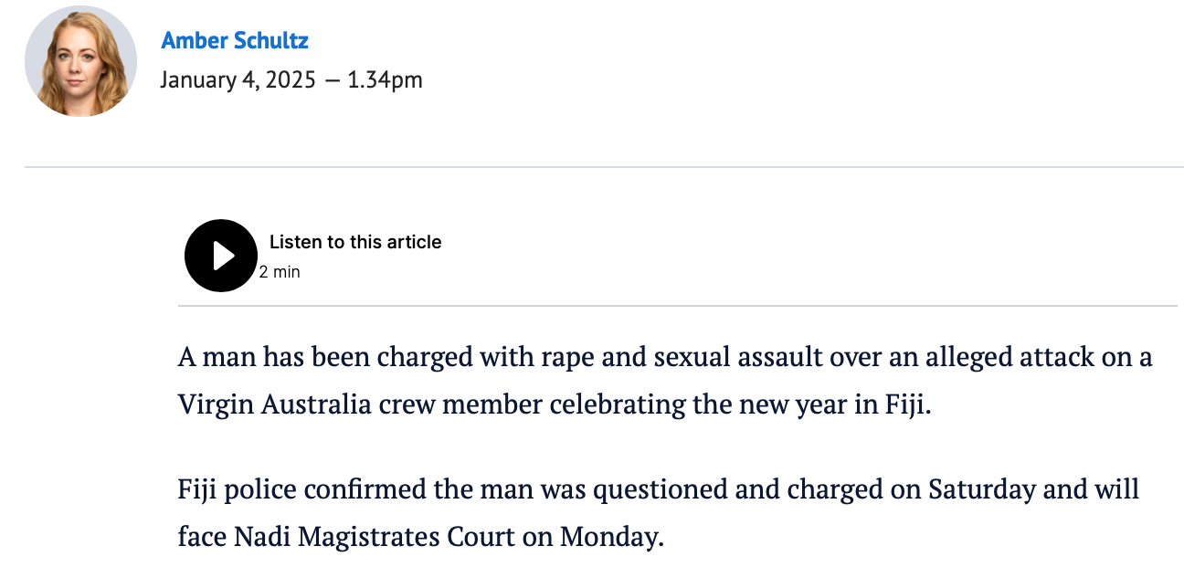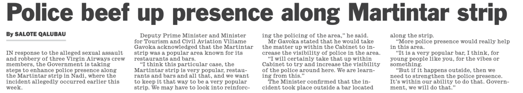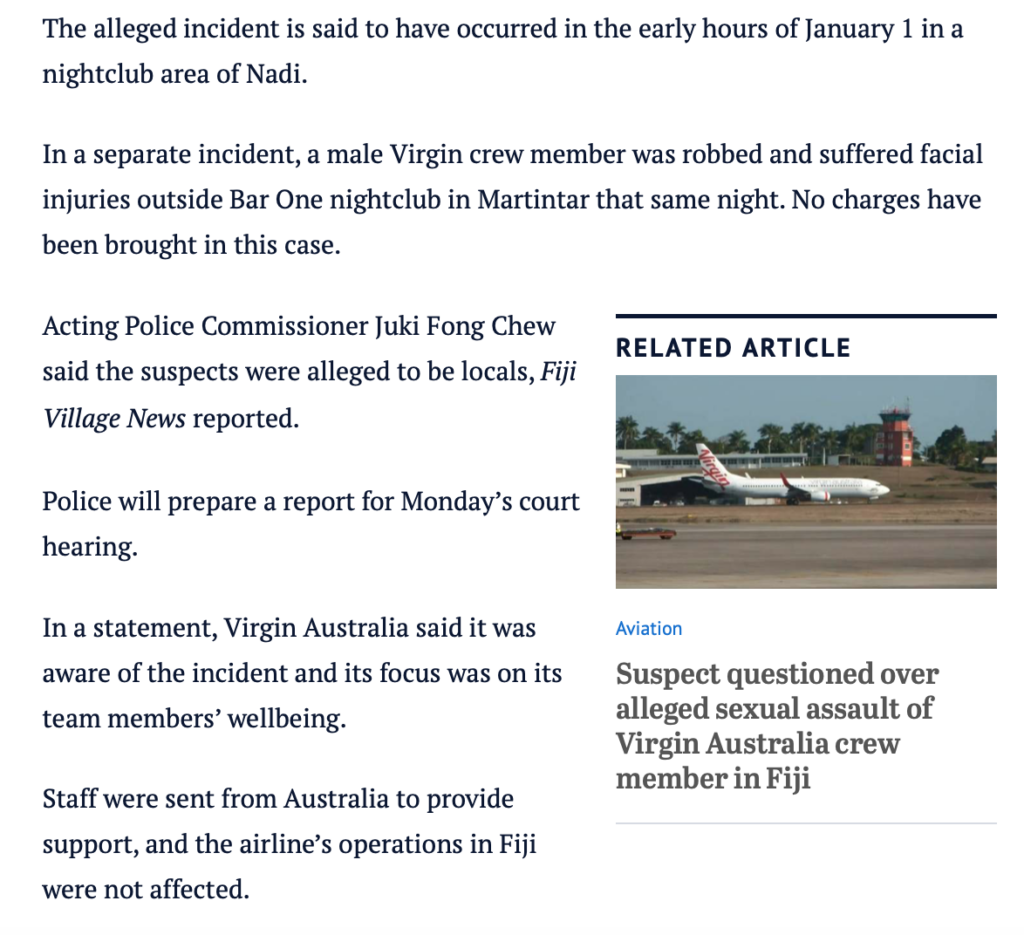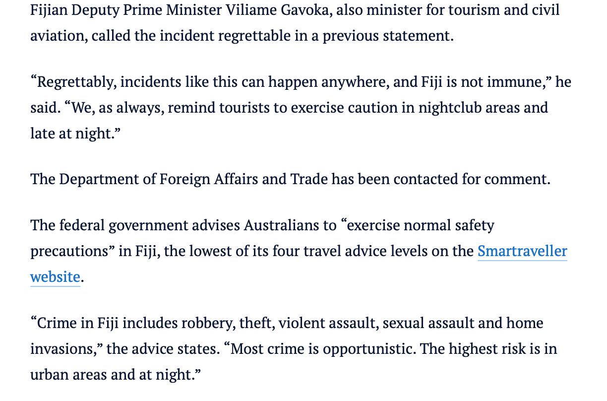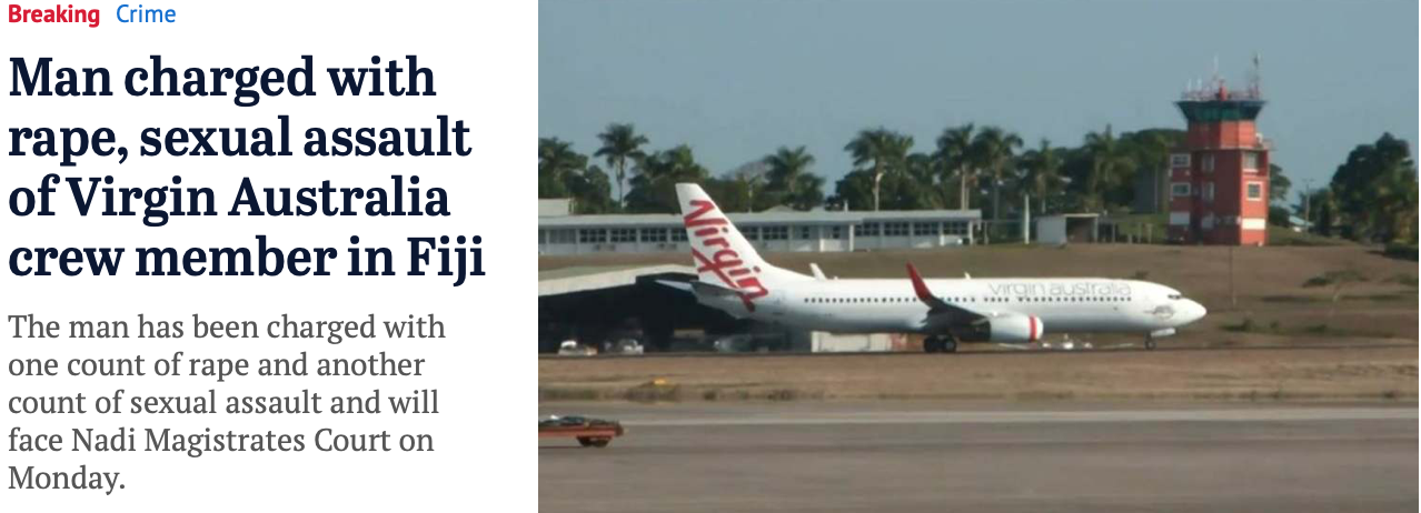Now that we know that an Australian Virgin Airlines flight attendant was definitely raped and another crew member bashed, the damage is done. We can expect the narrative to become that contrary to the assurances of the Fijian government, Fiji is not as safe as the government is claiming. And any attempt to spin this otherwise is just going to spike media scrutiny and make the whole thing worse.