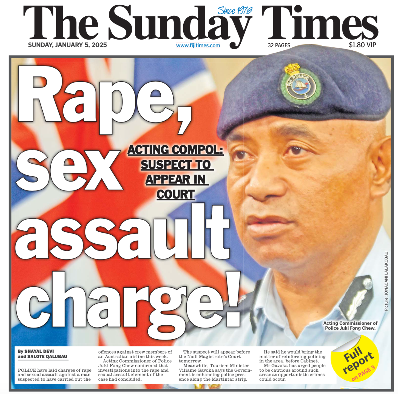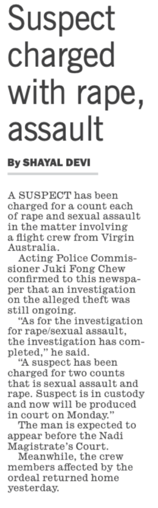 The charging of a Fijian man with one count of rape and one count of sexual assault puts an end to the pretence that the attacks on members of a visiting Virgin Airlines crew in Martintar on New Year’s Eve were being sensationalised by the international media and weren’t as serious as they were being depicted.