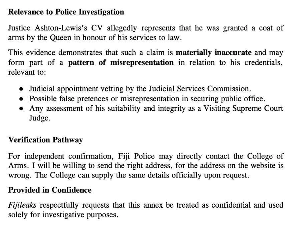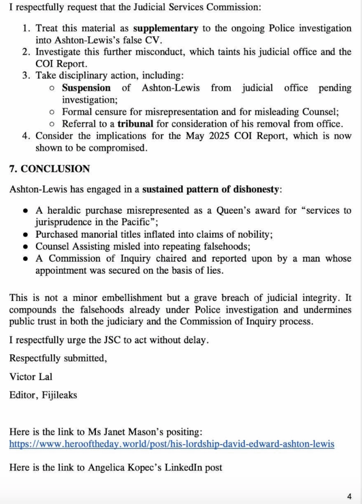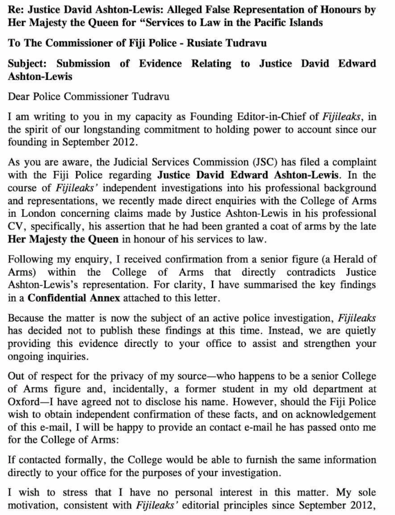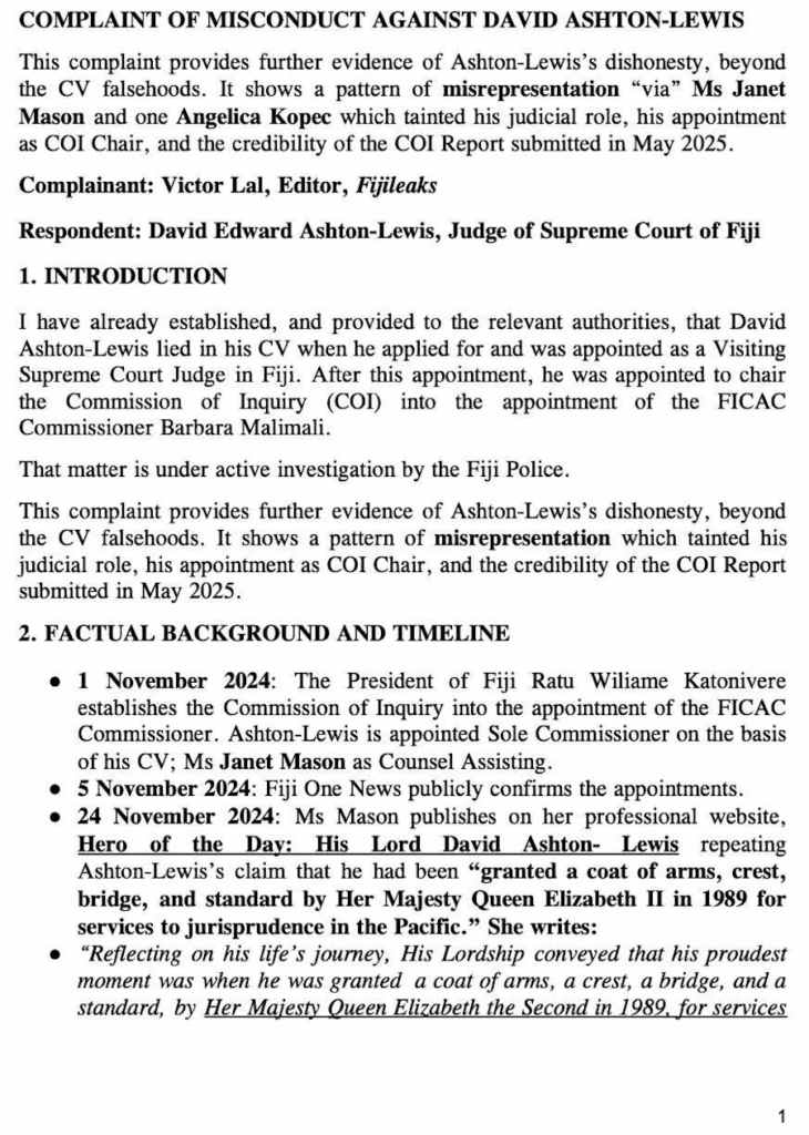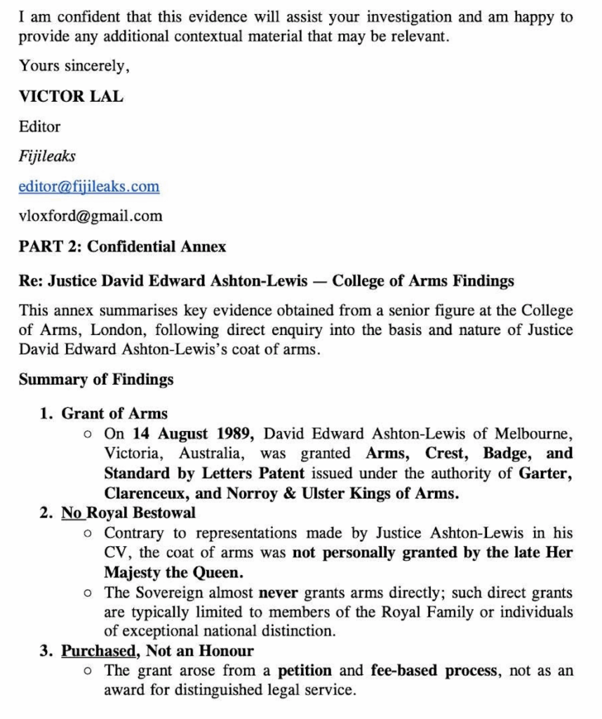 It’s now Grubsheet’s sorry duty to turn the tables on Victor Lal and leak the extraordinary contents of his complaint of misconduct against Justice David Ashton-Lewis plus accompanying correspondence to the Police Commissioner, Rusiate Tudravu. It shows that Victor Lal has sided with his British compatriot, Charlie Charters, in feeding Salesi Temo and the JSC the ammunition they presumably think he needs to upend the Commission of Inquiry.