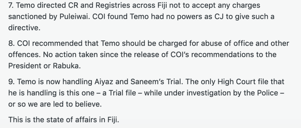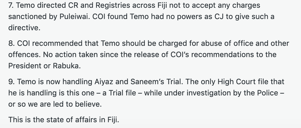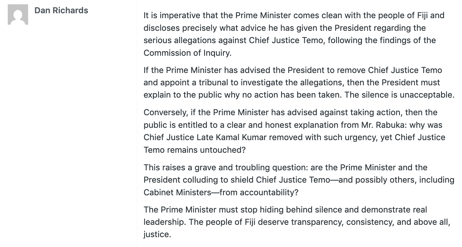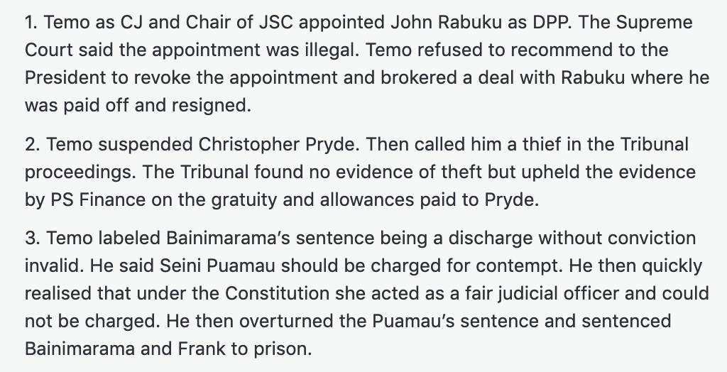 Yesterday is a case in point with the following comment on my last article about the conduct of the corrupt triumvirate of the Prime Minister, Sitiveni Rabuka, the President, Ratu Naiqama Lalabalavu and the Chief Justice, Salesi Temo. The CJ’s record speaks for itself.