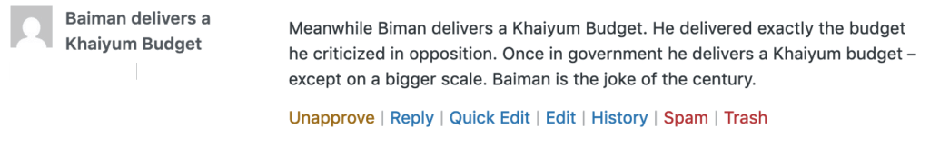 It’s up to Grubsheet to show up the fallacies in this budget and how it’s just another Khaiyum budget – except more of it is operational costs and less on capital expenditure, which to his credit was the focus of the Khaiyum budgets. Biman has come up with a cheap imitation. Shame on him.