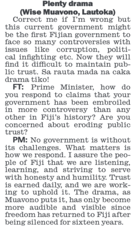 And finally, here’s the Prime Minister’s stock response to his critics like the Wise Man of Lautoka in his weekly Q&A session on reader’s letters with his handmaiden, Cherieann Wilson, in today’s Fiji Times.