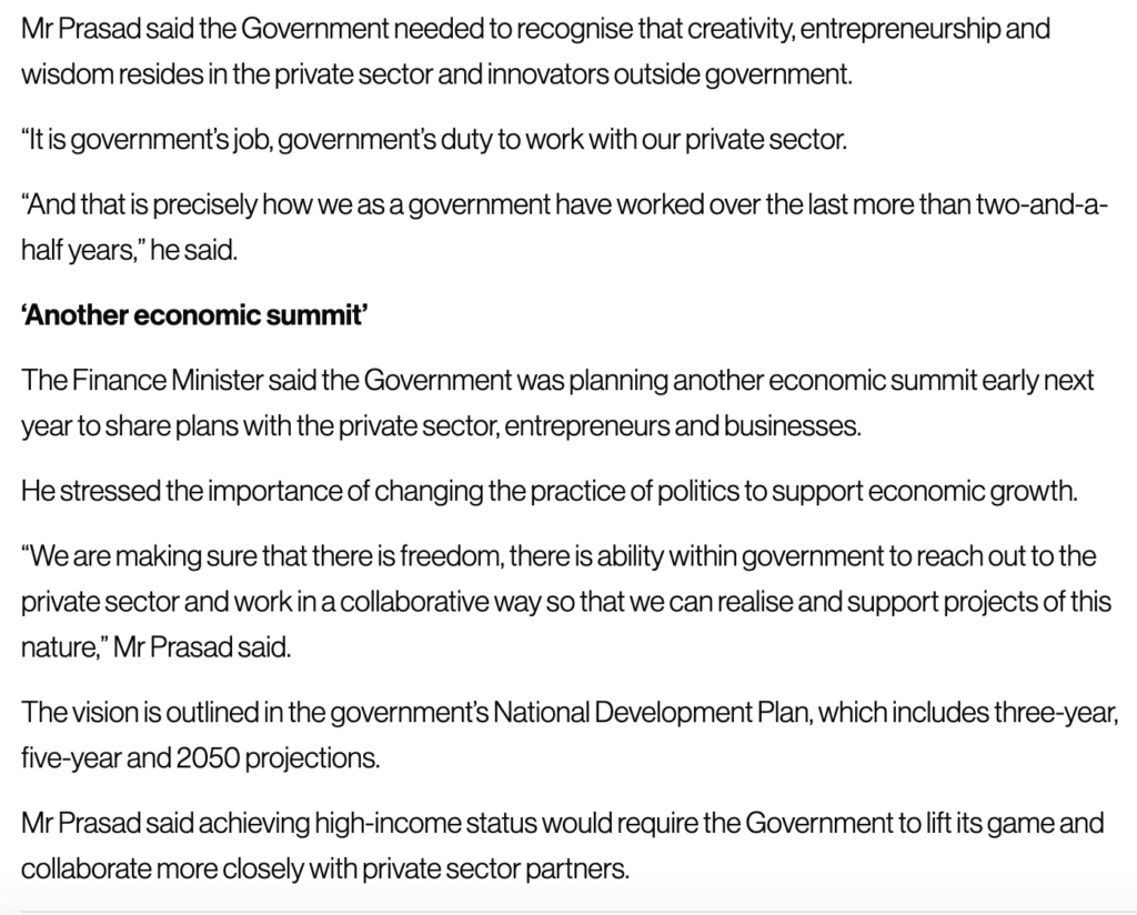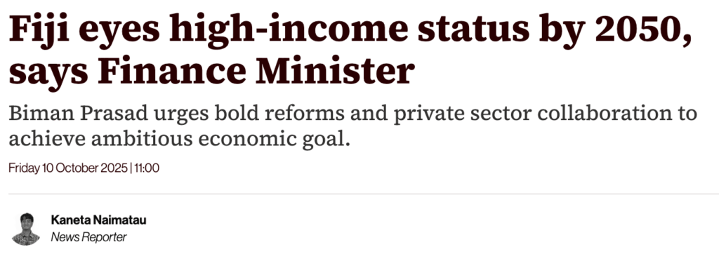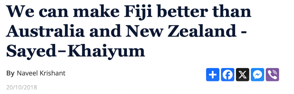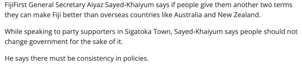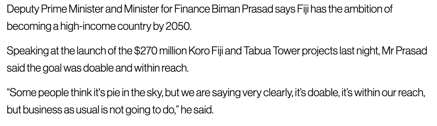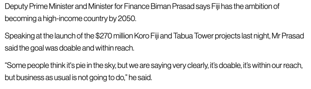 You’ll remember how we all laughed and laughed when Aiyaz said before the last election that Fiji could be “better than Australia and New Zealand” if we gave FijiFirst two more terms. Well, now Biman is making a similar absurd claim – that we will have first world levels of income by 2050.