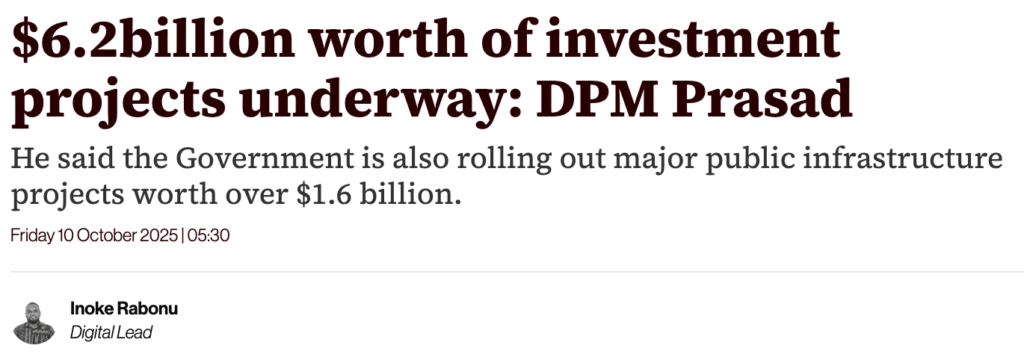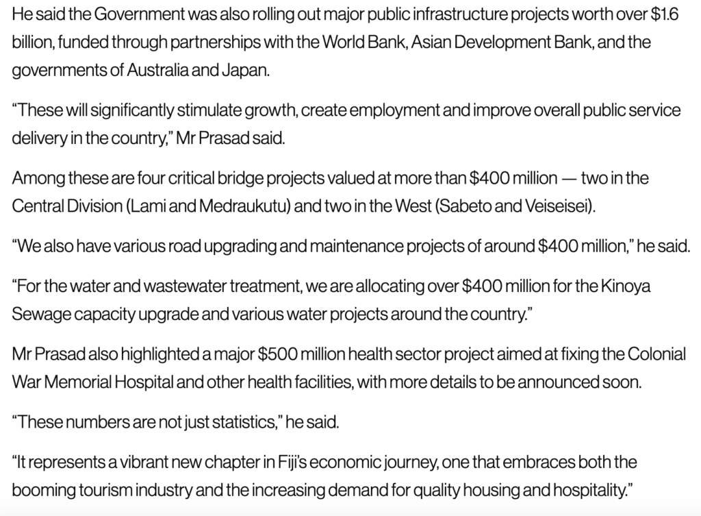 Professor Lasulasu-Jhoot also trumpets the claim that there are $6.2-billion dollars in development projects in the pipeline as the election approaches. Now precisely what are they? The Finance Minister doesn’t say, apart from the money already announced by Australia to assist with the rebuilding of the CWM Hospital and other infrastructure.