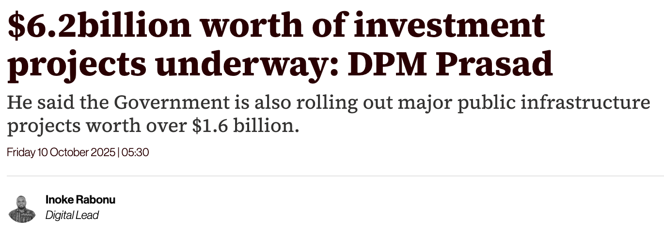 His major election promise was reduce debt and deficit. But he continues run deficits and increase debt. At least Khaiyum was frank about his budgets and there were major capital and infrastructure developments.