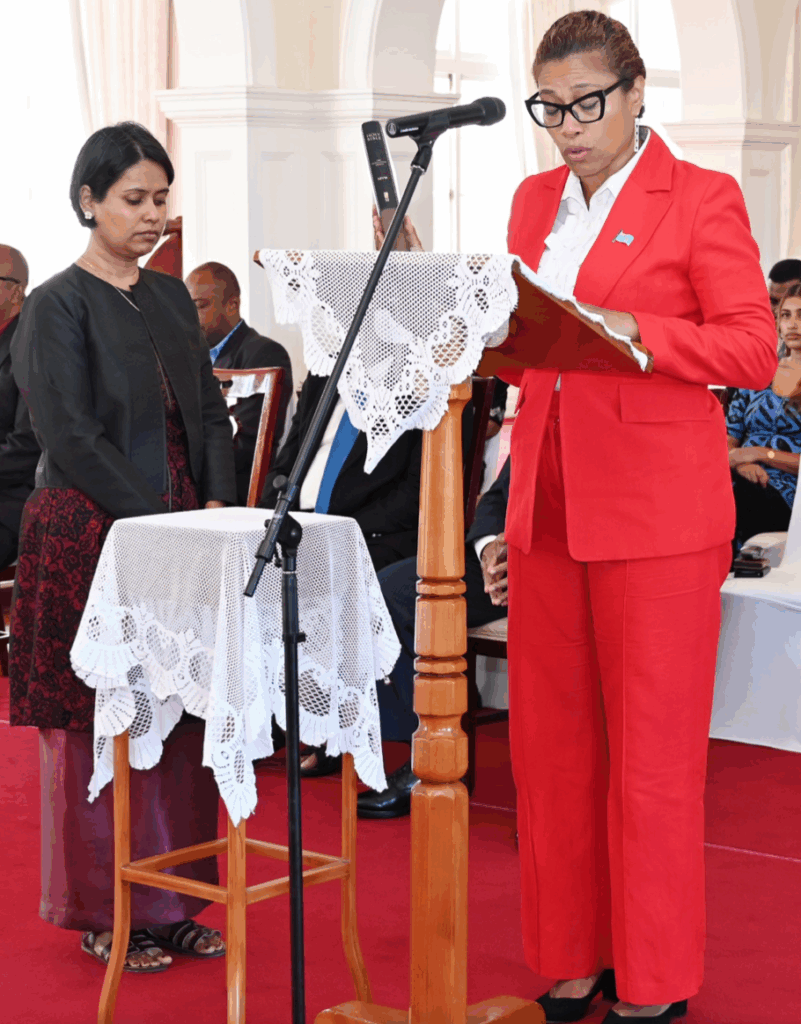 Lynda Tabuya – the Slut from Room 233* – was sworn in as Minister for Information today by the Pedophile President*, Ratu Naiqama Lalabalavu, wearing a garish red pantsuit – the perfect outfit for the scarlet woman now in charge of the Coalition’s propaganda effort.