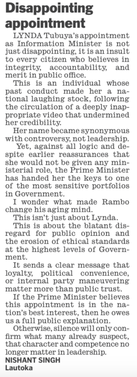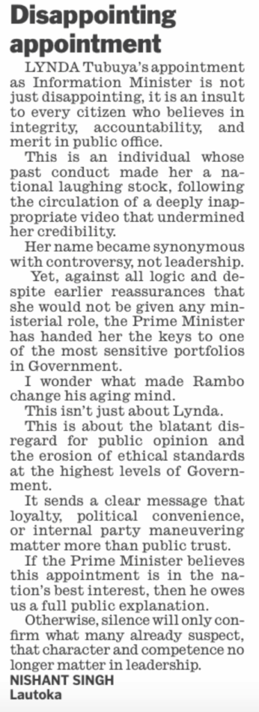 It seems Rabuka is also rewarding Lynda for that public attack against Sainiana. Well Rabuka is Lynda’s uncle after all and that makes Lynda and Aseri’s ex wife Salaseini, cousins !
