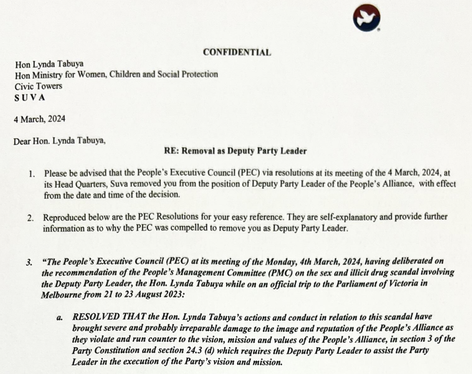 This takes on a particular resonance when we know that the Prime Minister, Sitiveni Rabuka, and the People’s Allliance he leads found Lynda Tabuya guilty of a”sex and illicit drug scandal” during a parliamentary visit to Melbourne in August 2023.