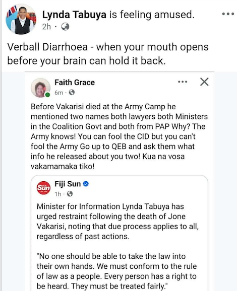 One allegation on Facebook by a former SODELPA candidate, Faith Grace, has it that Jone Vakarisi mentioned the names of two lawyers who are PAP ministers in the Coalition government. One is Lynda Tabuya. Who is the other? Filimoni Vosarogo? Siromi Turaga?