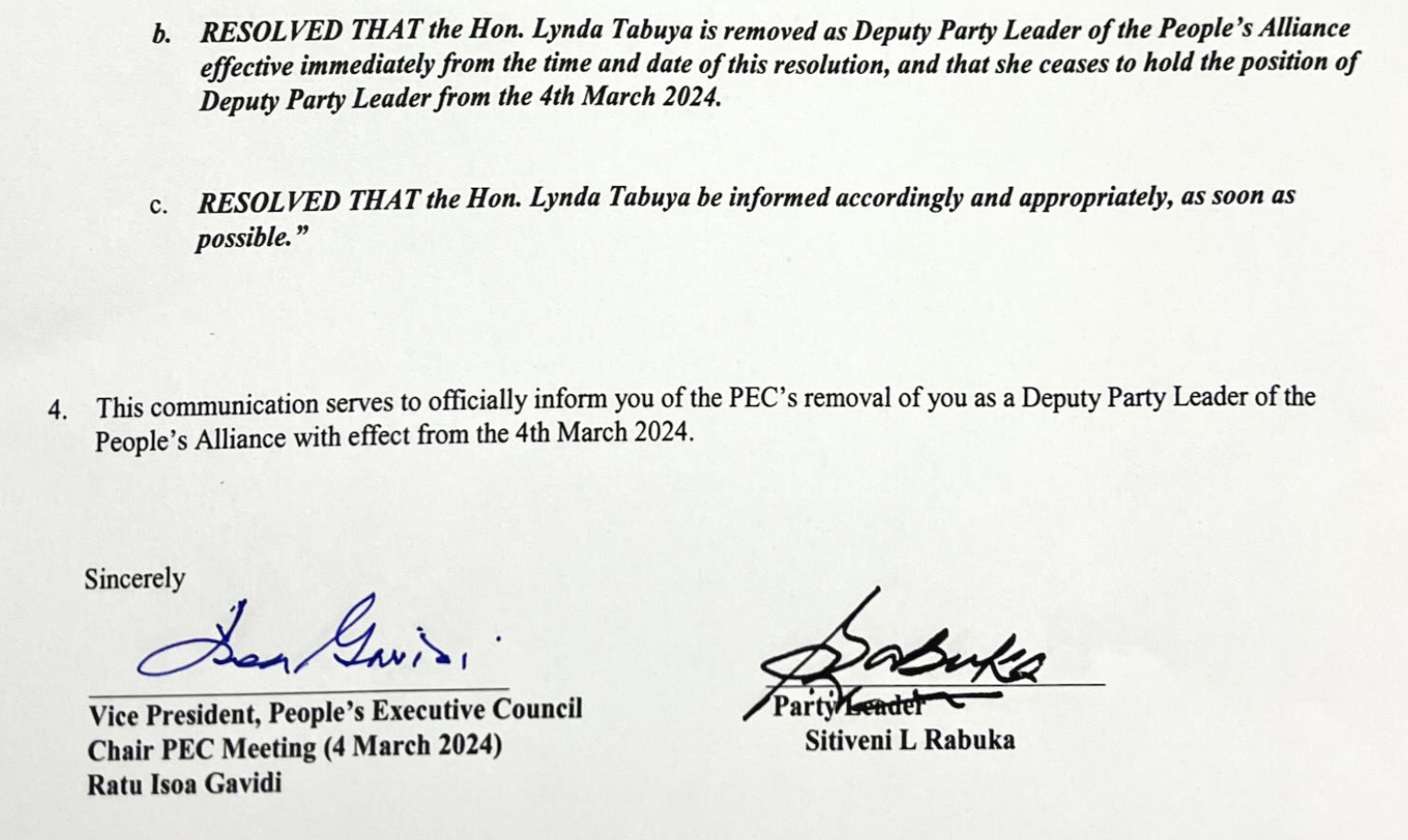 It is a matter of record that while Lynda Tabuya was removed as PAP deputy leader, Rabuka kept her on as Minister for Women, Children and Social Protection. Incredible.