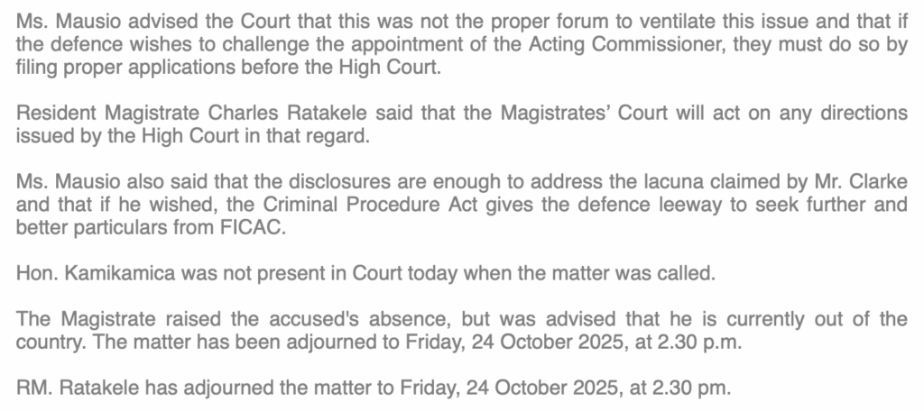 “The system is still functioning. Individual judges and magistrates are independent. And any intervention to block charges arising from FICAC or police investigations would lead to a complete breakdown of the rule of law”, this person opined.