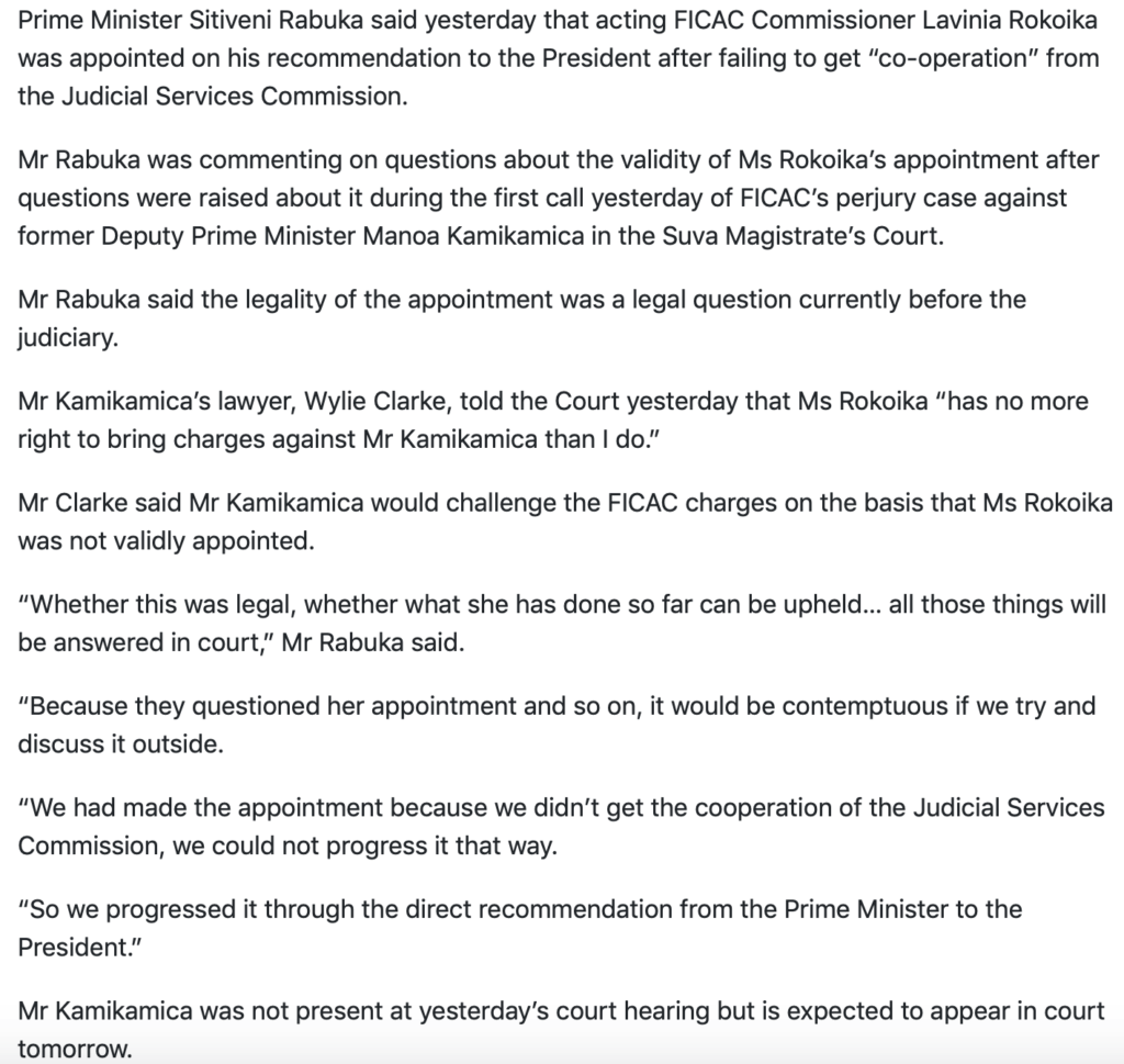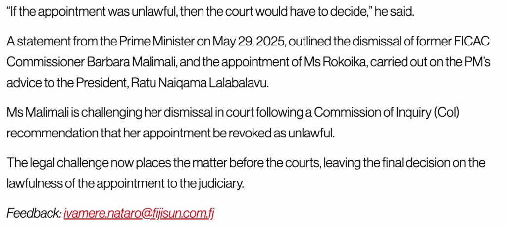 Section 5 of the FICAC Act – it found – is ultra vires of Section 82 of the Constitution. In other words, Section 5 is invalid because it is contrary to Section 82. And the CoI concluded and recommended that given these circumstances, the Prime Minister did have the authority to suspend Barbara Malimali and make a fresh appointment by advising the President directly. So Rabuka is on safe ground legally.