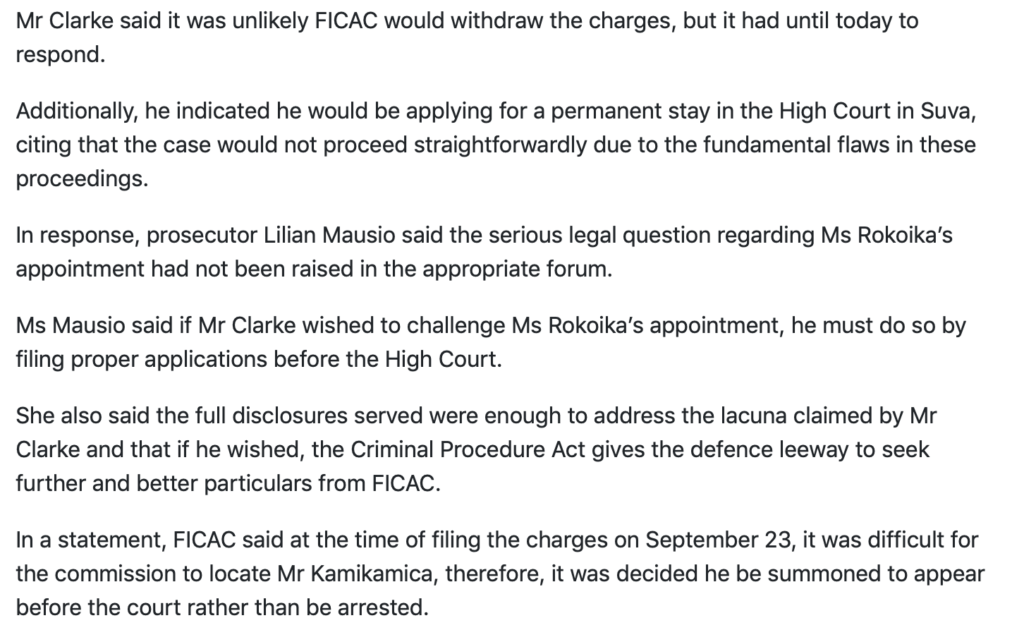 The suggestion that they were there to support Kamikamica personally stretches credulity. He wasn’t even present, having not yet returned from overseas. No, they were much more likely to be there to support Wylie Clarke in his desperate attempt to shut down the FICAC prosecution by seeking a stay of proceedings in the High Court. And why would that be? The rumour mill in Suva has now given us a possible answer.