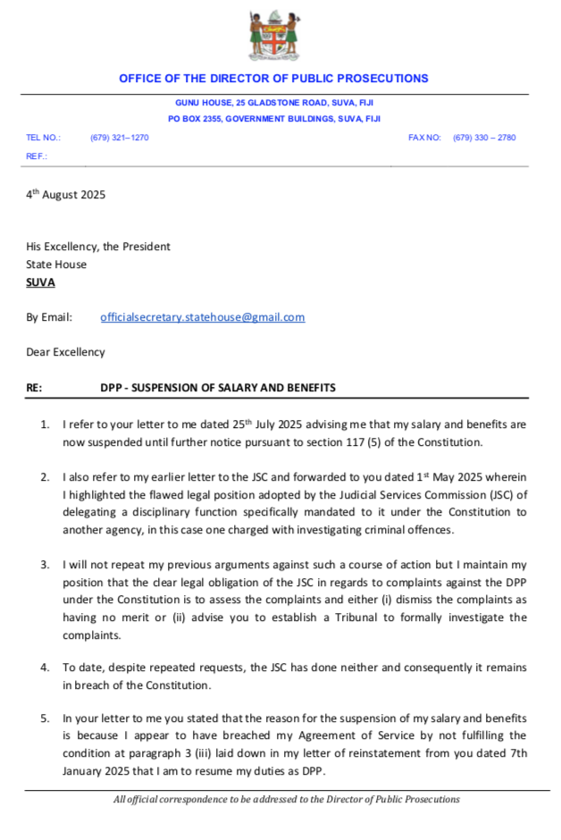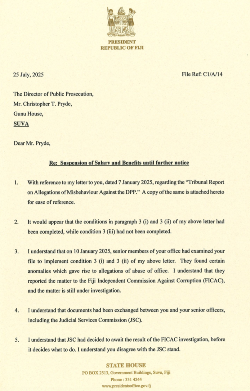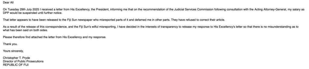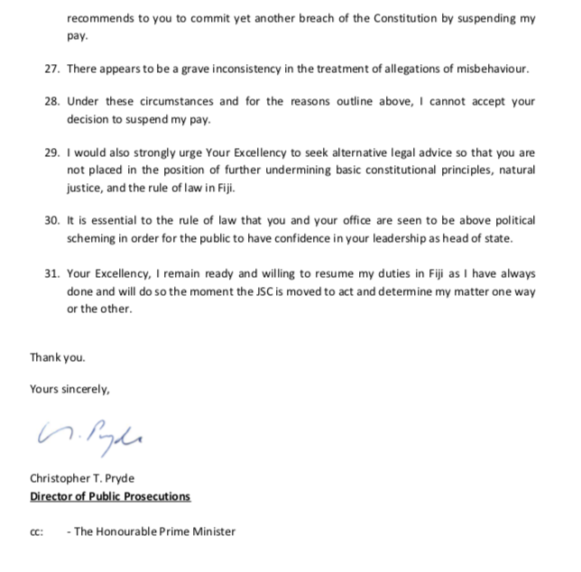 Christopher Pryde says he is doing so because the State has leaked selected passages of the letter of suspension from the President to the Fiji Sun newspaper and the situation needs to be clarified. The DPP is suing the Fiji Sun for defamation for refusing to correct its false claim that he has continually refused to explain his absence from Fiji even though he was exonerated of wrongdoing and reinstated back in January.