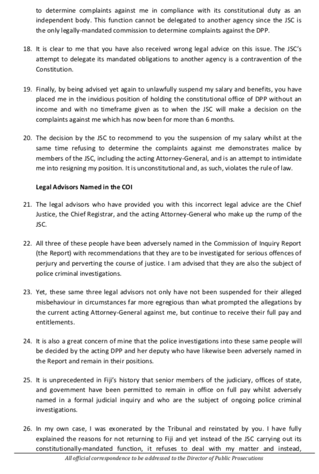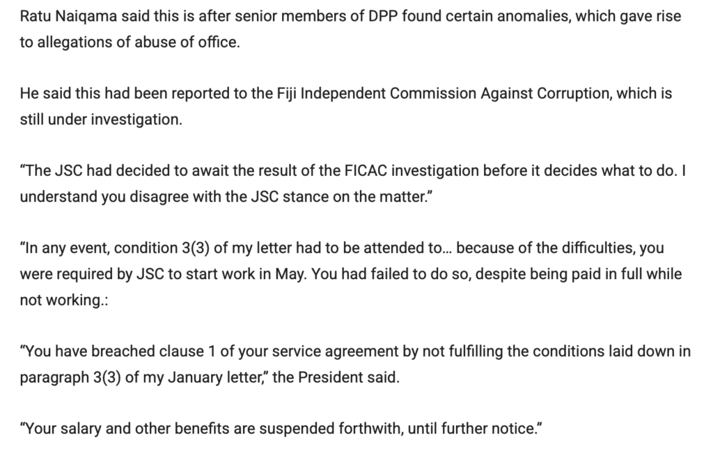 True to form, the Fijian mainstream media has overwhelmingly ignored the contents of the above exchange of letters, despite the extraordinary spectacle of the substantive DPP telling the President that he has broken the law – contravened the constitution – by suspending his salary.