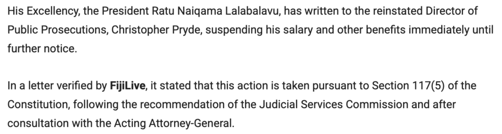 One exception is Fiji Live, which headlines the old news that the DPP’s salary has been suspended but ignores its most basic duty to balance the story with Christopher Pryde’s response. It is an astonishing breach of journalistic ethics.